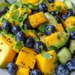 Imagine the first forkful: the sweetness of ripe mango dances with the crunch of cucumber, while the blueberries burst in your mouth, their tangy flavor balancing the rich, smooth avocado. You can almost hear the satisfying crunch as your teeth break through the fresh ingredients, and the aroma of lime mingles with the bright notes of cilantro, elevating this medley to new heights. Whether you’re serving it as a side or enjoying it as a light meal, this salad is an ode to summer’s best offerings, destined to make your taste buds sing and your heart skip a beat.