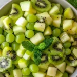 A vibrant salad bursting with the freshness of kiwi, green grapes, and honeydew, perfectly drizzled with honey and lime juice for a refreshing treat.